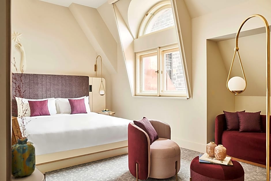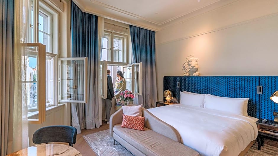 Enjoy our elegant, contemporary design Deluxe King bedroom with big, bright windows overlooking the charming streets in the heart of Prague. Lounge on the chaise-longue and savor the new and precisely detailed, art deco-inspired rooms with hardwood floors or soft carpet. The private bathroom has a shower and luxury Byredo toiletries. The room amenities include a complimentary mini-bar with select local snacks and beverages and a flat-screen TV with a casting option.