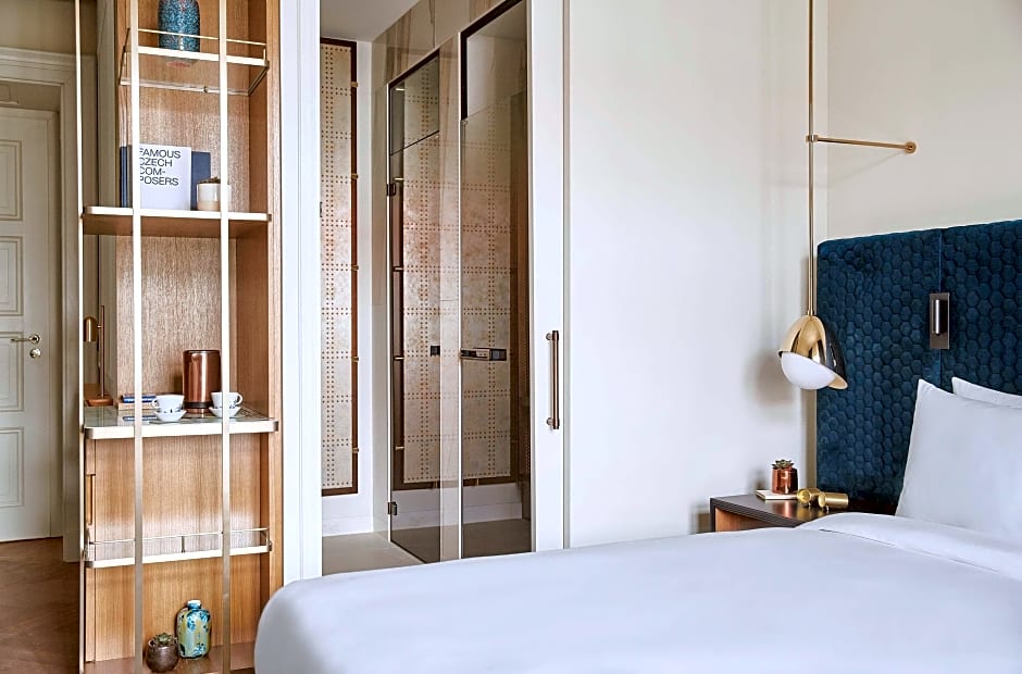 Enjoy our elegant, contemporary design Deluxe King bedroom with big, bright windows overlooking the charming streets in the heart of Prague. Lounge on the chaise-longue and savor the new and precisely detailed, art deco-inspired rooms with hardwood floors or soft carpet. The private bathroom has a shower and luxury Byredo toiletries. The room amenities include a complimentary mini-bar with select local snacks and beverages and a flat-screen TV with a casting option.