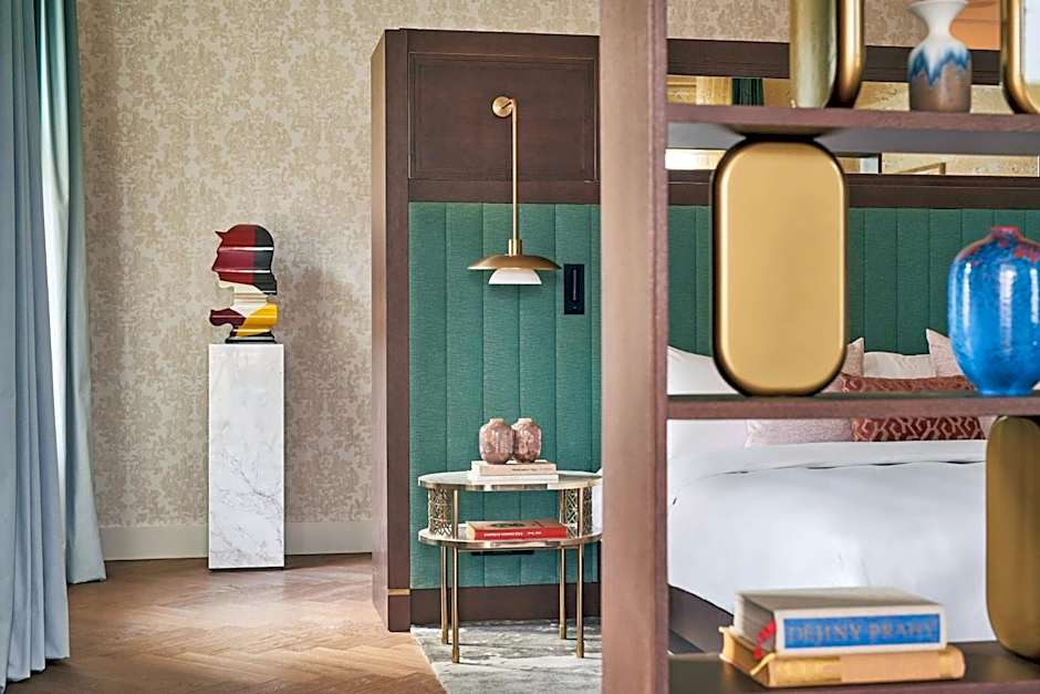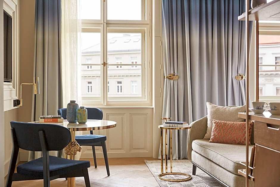 Enjoy a connecting option of our new, spacious Studio suite, perfect for travelers looking for two king bedrooms. Connecting the Studio suite with the Deluxe View King bedroom can provide you with that extra space. A whole family can enjoy the inspiring views, the spacious, airy living room, and a dining table for four in the living area overlooking the picturesque Prague streets. The private bathroom features a large bathtub, shower, and luxury Byredo toiletries. The suite amenities include a complimentary mini-bar with select local snacks and beverages, and a flat-screen TV with a casting option.